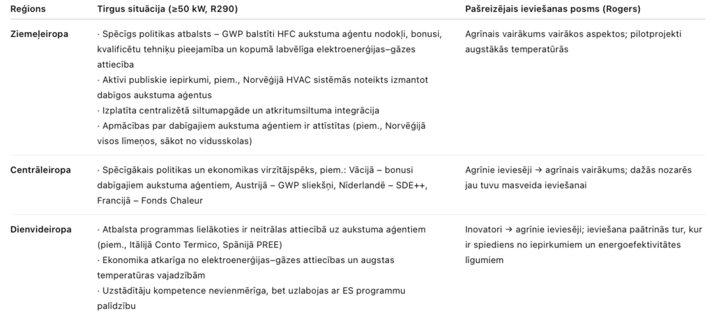 Ja pārvaldāt portfeli vai valsts īpašumu, izmantojiet Ziemeļeiropu kā atsauces punktu R290, ≥50 kW gadījumā. Tur ir skaidri noteikumi, uzticami stimuli, apmācīti uzstādītāji un atkārtojams tehnisko telpu plānojums. Attiecībā uz citiem reģioniem ieteikums nav visu kopēt, bet gan novērst trūkumus, kas neļauj vērtības līknei sasniegt Ziemeļeiropas līmeni.