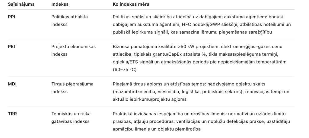 Lai palīdzētu pārvērst politikas mērķus reālos projektos, ir izveidota uz kritērijiem balstīta sistēma, kas palīdz ieinteresētajām personām, kas iesaistītas ≥50 kW HVAC projektos, pieņemt propānu (R290) kā aukstuma aģentu. Sistēma sadala tirgu četros diagnostiskos indeksos, kas atspoguļo politikas ietekmi (PPI), projekta ekonomiku (PEI), tirgus pieprasījumu (MDI) un tehnisko un riska gatavību (TRR). Katram indeksam tiek piešķirts vērtējums no 1 līdz 5.